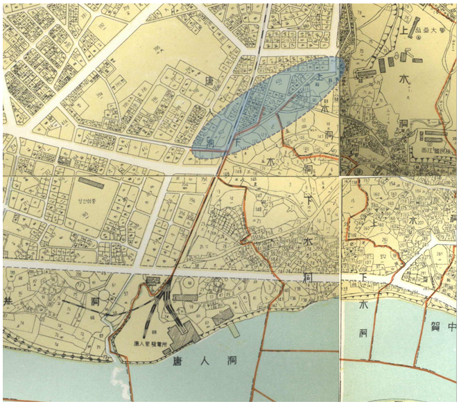 (참고로 남북방향으로 난 철길은 당인선으로, 서강역-당인리역을 잇는 용산선의 지선이었다. 1982년 폐선 후, 공터로 있다가 1990년대 주차장이 조성되면서 현재의 걷고싶은거리-홍대 주차장길-이 되었다.)