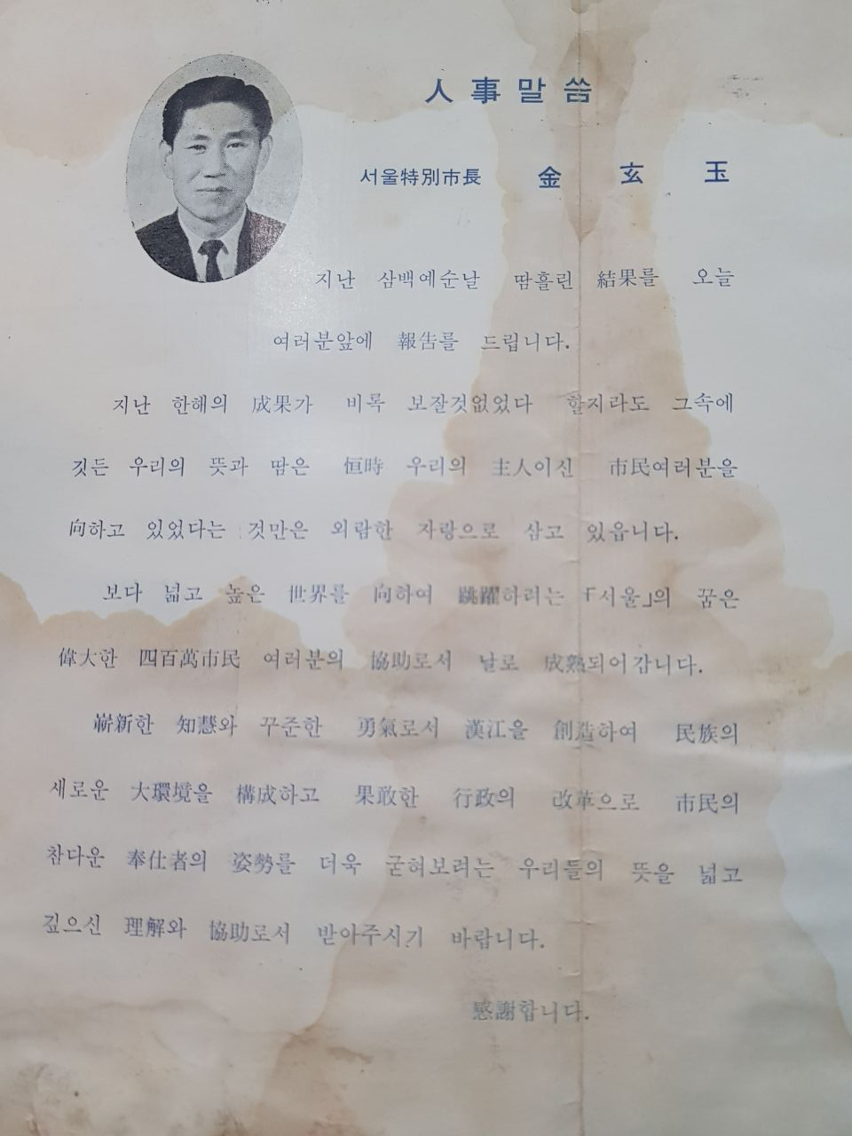 지난 한해의 성과가 비록 보잘것없었다 할지라도 그 속에 깃든 우리의 뜻과 땀은 항시 우리의 주인이신 시민여러분을 향하고 있었다는 것만은 외람한 자랑으로 삼고 있읍니다.